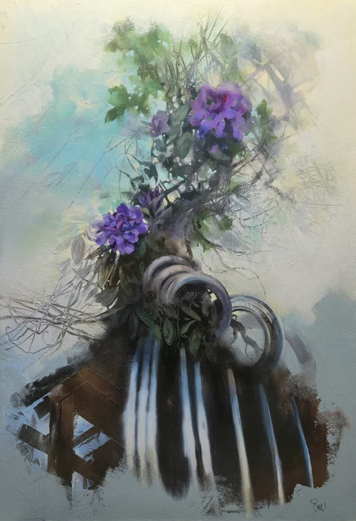Abstract beginnings using broad brush work are contrasted by small areas of painted detail. Sections of the canvas are covered with layers of thick paint where objects and patterns are scraped into the surface.